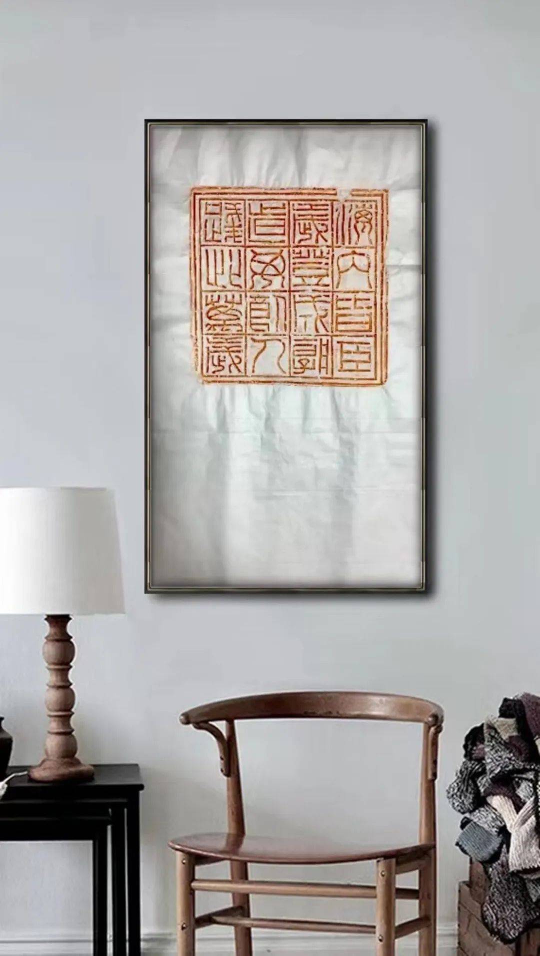 十三字汉砖拓本。朱拓,尺寸:100*50厘米。最后一图是题跋后效果非卖品!此漢“家富昌,田大得穀,後世長樂未央”磚,書體端正開張,呈樸茂之典型。漢方磚吉語少見奇數詞,此則對稱章法,錯落有致,而中宮緊湊,整體氣勢恢宏,實可寶也。夫豐年者,所資殷富也,今世之足,後代樂之所基也,漢人經濟人生、世代孳育之觀可見於磚文者也。汉砖是当之无愧的一个重要收藏品类。十三字漢砖较为少见留有空白题写跋文,是馈赠收藏之佳品!